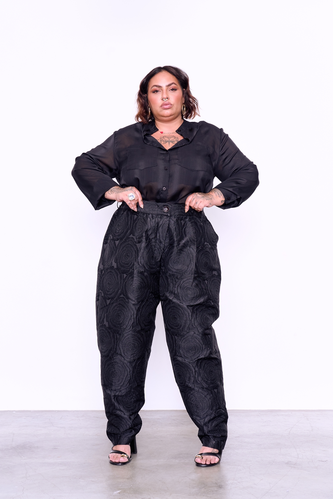 A CALÇA ALFAIATARIA BALLON JACQUARD PRETO PLUS SIZE é a peça perfeita para criar produções elegantes com toque contemporâneo. O jacquard de flores é estruturado e tem um brilho sutil e confere ousadia para a peça. Aposte na combinação com a camisa leve “hanami” ou de “Algodão com Seda” para um visual sofisticado.