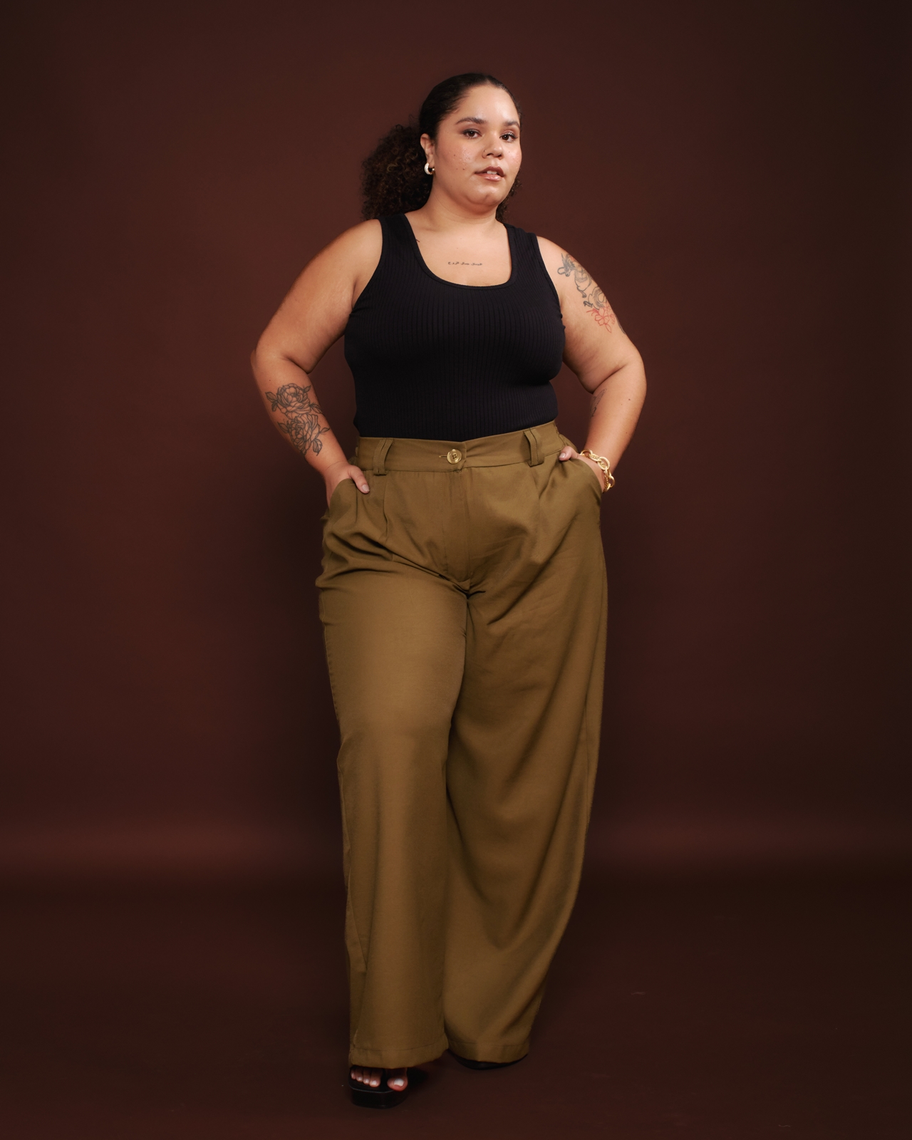 A CALÇA ALFAIATARIA VERDE MUSGO PLUS SIZE tem o conforto priorizado através do corte reto ajustado nas pernas e cintura alta. Perfeita para produções de todos os tipos.