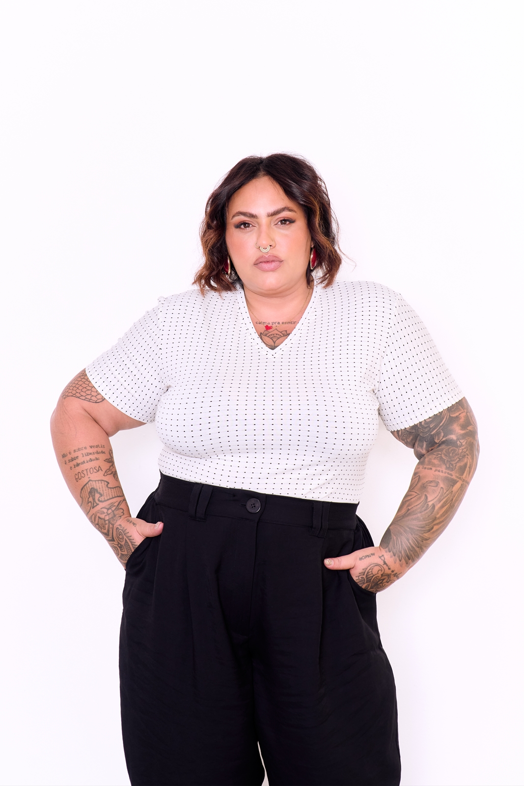 A Modelo Amanda tem 1,60 de altura, 120 de busto, 106 de cintura e 138 de quadril – veste Tam 50