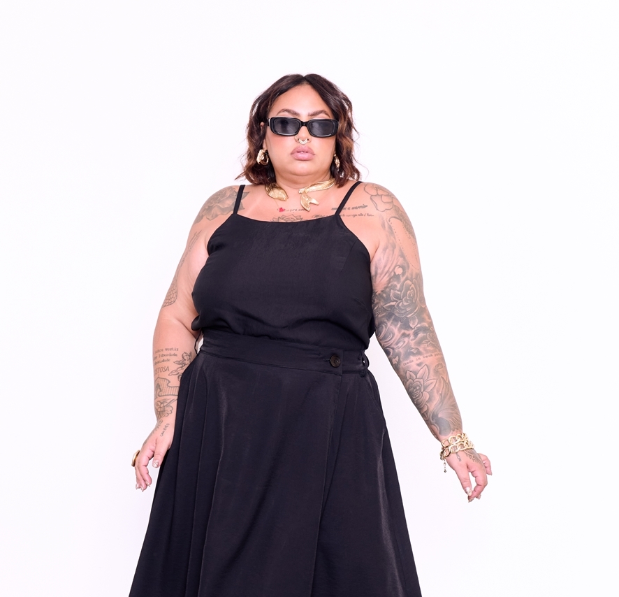 A Modelo Amanda tem 1,60 de altura, 120 de busto e 106 de cintura – veste Tam 50